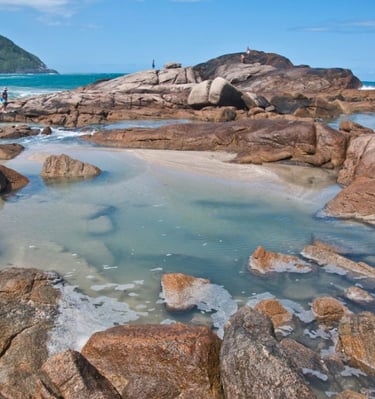 A Praia do Rosa, em Imbituba/SC, é uma baía famosa por sua beleza natural, surf, ecoturismo e atmosfera rústico-chique, sendo um destino que combina natureza preservada (Mata Atlântica, lagoas, montanhas) com estrutura de lazer, restaurantes e hospedagens charmosas, atraindo surfistas, famílias e amantes da natureza, com destaque para a observação de baleias-francas entre julho e novembro e trilhas ecológicas.